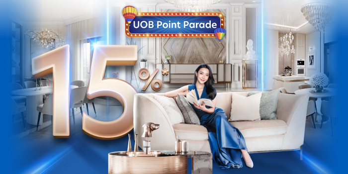 Enjoy 15% cashback when you redeem your UOB Rewards points equal to your spending at participating home and living stores. Simply spend THB 10,000 or more per sales slip with full payment on Fridays, Saturdays, or Sundays for UOB Reserve, UOB Infinite and UOB Zenith